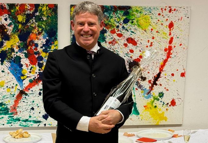 August 2025: Verabschiedung von Vikar E.C. Hoberg durch Pfarrer M.Lintner und Pfarrerin A. Tikkanen-Lippl beim Heurigen -Gottesdienst. -