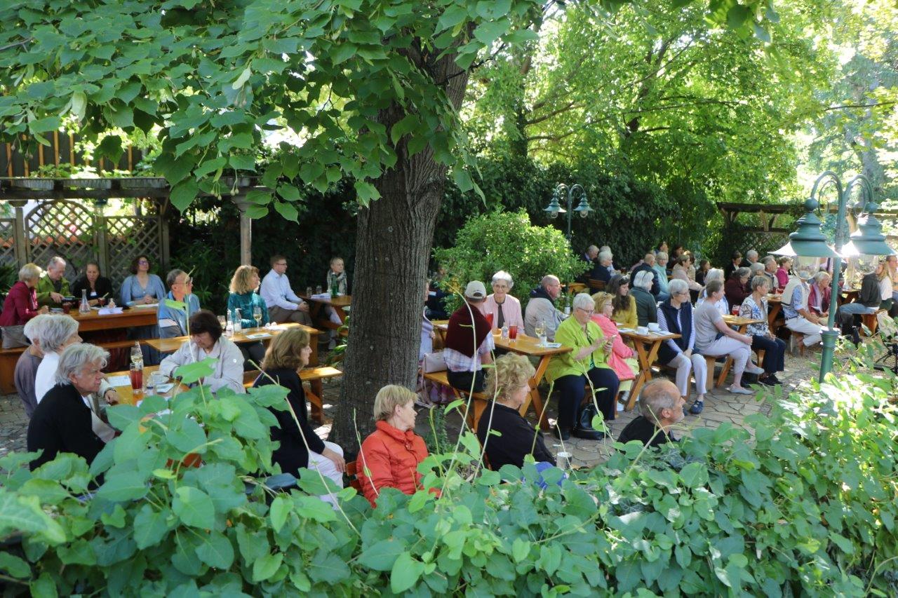 Viele Besucher beim schon traditionellen Heurigengottesdienst bei prächtigem Wetter im Garten des Heurigen Pferschy-Seper. -